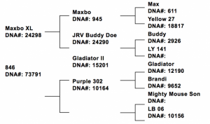 He has the look. He has the frame. He also has the pedigree! This is basically perfection in a 2yr old buck! How many 2yr olds have you ever seen that are this wide, that have an 8×7 main frame and have multiple breeder bucks out of his sire and the dam? For a 2yr old to have this look and also have this many inches is almost unheard of! Gladiator XL has the potential to reach superstar status at an early age. Anyone serious about breeding knows how powerful Maxbo XL and Gladiator II are but, what makes this buck special is his mother and grandmother. 846 also has a womb brother named Gladiators Reign that is a breeder buck. Adding to that she has another 1/2 sister (same mother, Purple 302) that has a 300″+ 3yr old on the ground as well! Purple 302 is a daughter out of a Mighty Mouse son. We all know how strong that TX line is and it is obvious when you look at the pass down we are seeing through her and her daughters. This pedigree is loaded with production and big names. If you are serious about growing big framed deer that look awesome you need Gladiator XL in your herd!